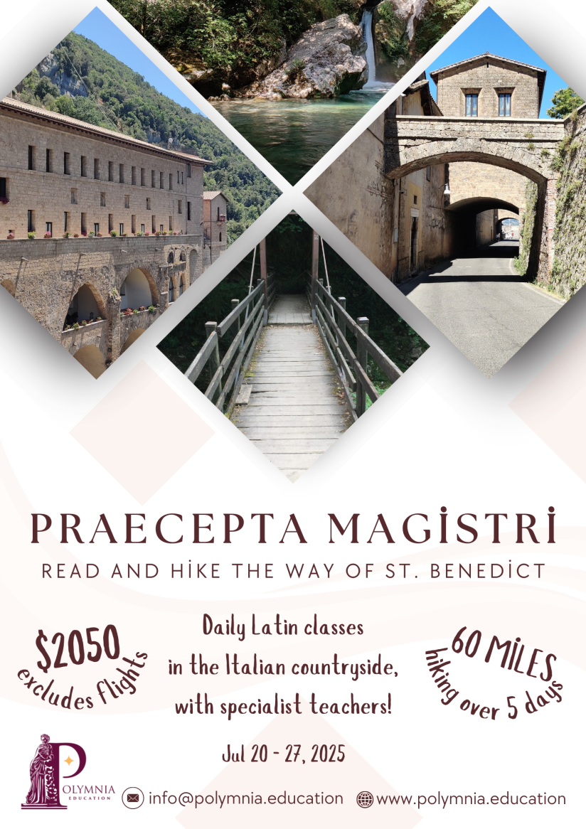 Auscultate! Revel in the natural beauty of the Italian hills, explore medieval monasteries and towns, and read in Latin the ancient wisdom of the patron saint of Europe in Praecepta Magistri: Read and Hike the Way of St. Benedict.